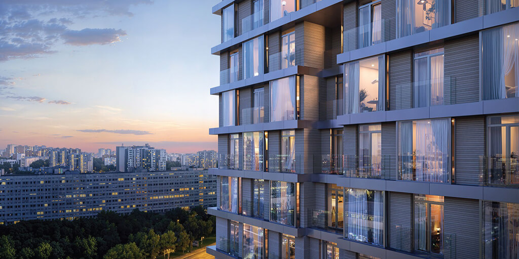 Фасады зданий выполнены с использованием тёплого алюминиевого профиля, энергоэффективного остекления и архитектурной подсветки. Джамбо-окна и балконы в каждой квартире усиливают визуальную лёгкость зданий и наполняют интерьеры естественным светом. Пентхаусы с террасами становятся выразительным акцентом верхних этажей, подчёркивая статус проекта.